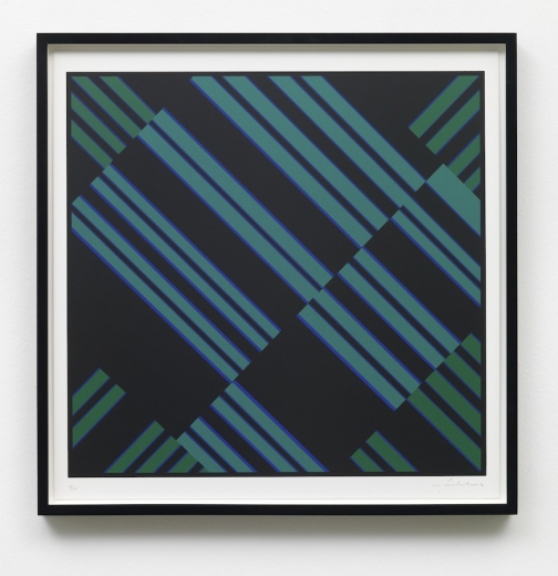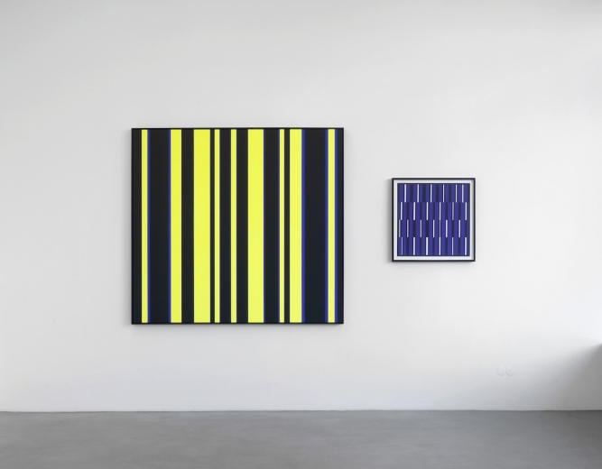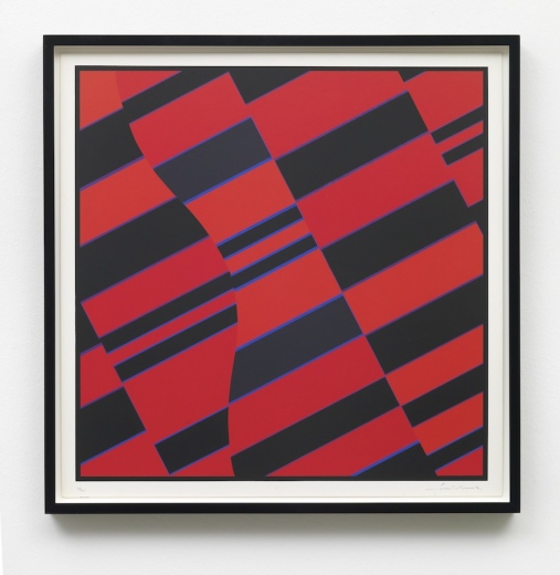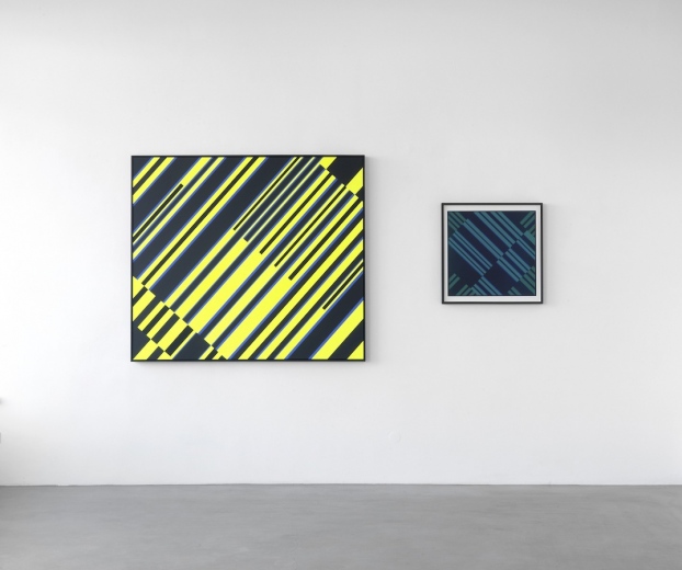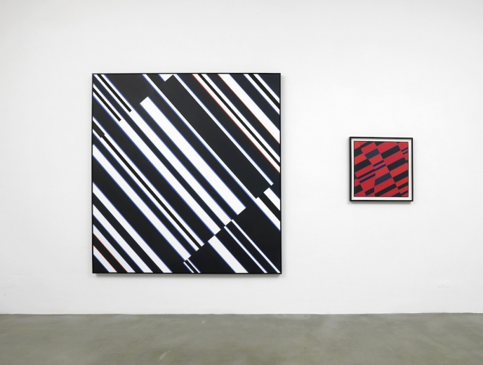 Part 1 comprises Ebner’s reconstruction of Fruhtrunk’s paintings Mit Roten Randzonen, Progression Gelb-Blau-Schwarz and Cantus Firmus, in combination with coloured serigraphs which are part of a portfolio by Verlag der Spiegel, Cologne.