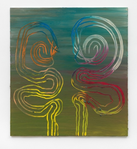 Die Komplexität changierender Farbe in diszipliniert gestischer Form unterscheidet sich in einem Maße vom zurückhaltend modulierten Grund, dass die Figuren energisch nach vorn drängen. Doch die Hierarchie von passiver Matrix und sich ihr entwindender Gestalt trügt. Tatsächlich liegen die Farbbänder unter der Fläche, über die sie sich zu erheben scheinen.