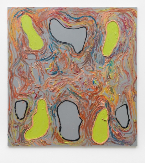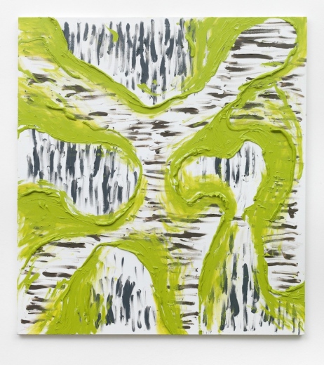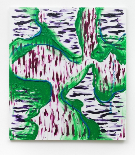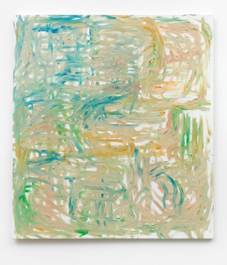The complexity resulting from the combination of iridescent colour and domesticated gesture stands in stark contrast to the calmly modulated ground, which makes the shapes press forth vigorously. The hierarchy between the passively retreating matrix from which a gestalt wrenches its way to the fore is illusive, though. Obviously standing out, the streaks indeed lie beneath the plane over which they seem to hover.