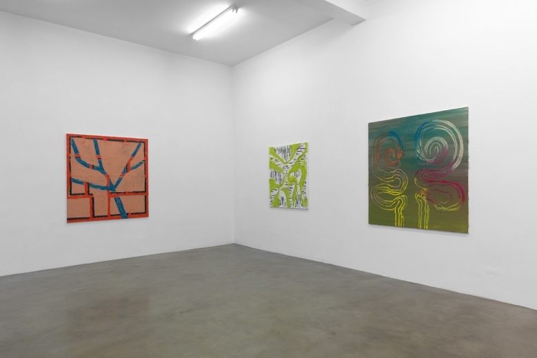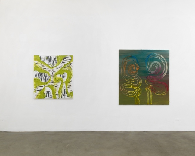 Die Ambivalenz von oben und unten setzt sich fort. Auch die ob ihrer Geschlossenheit als Gestalt wahrgenommenen zartblauen Gebilde scheinen aus einem nervösen Gewebe empor zu steigen, obwohl ihre Ränder in Wirklichkeit die dem Geflecht zugrunde liegenden Lackgrund aussparen. Dieses Freilegen des Eingeschlossenen entspricht dem Thema des Ein- und Ausschließens, das sich mal ein- mal vieldeutig durch vier Gemälde zieht. Während Binnenformen inmitten eines kleinteiligen Farbgeflechts als Einheiten erkennbar sind, wandelt sich Innen und außen nach dem Prinzip eines Möbius-Bandes. Die untrennbar verzahnten olivgrünen und schwarzweißen Flächen wechseln ihre mal positive, mal negative Funktion wie Kippfiguren. Auch das zweifache Voluten-Motiv lebt vom Ein- und Ausschwingen der Linien, die fließend vom Äußeren zum Inneren übergehen.
