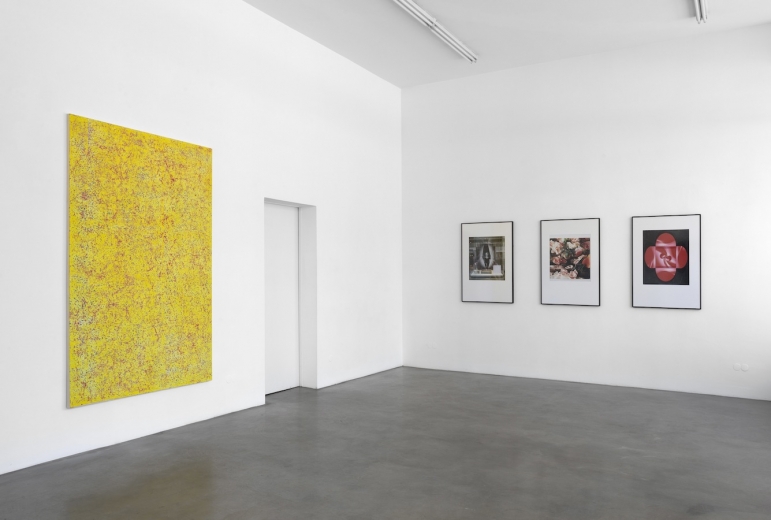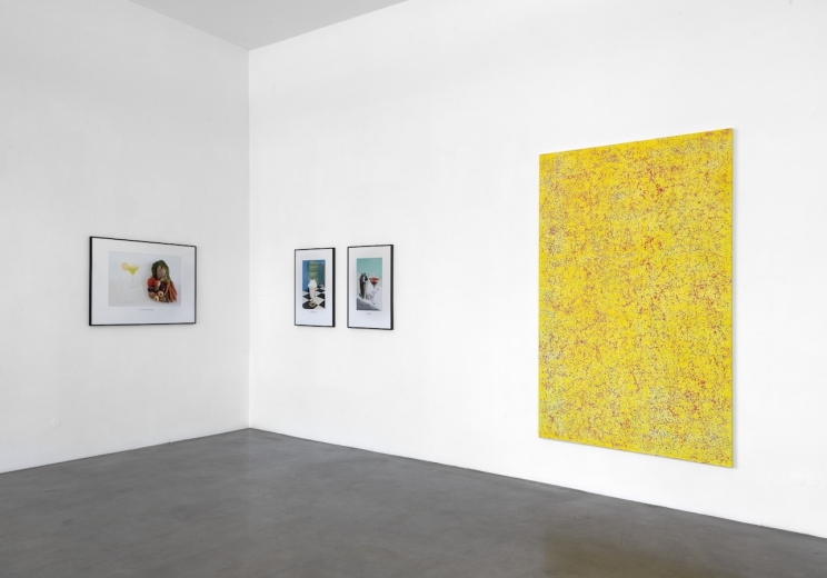 Velvet, hardly nuanced planes of indeterminate depth are activated by unruly gesture. Transparent and opaque areas of glacial and fiery temperatures encompass and overlap pictures of yoga-postures, whose black and white surroundings create a buffer zone against charging colors.