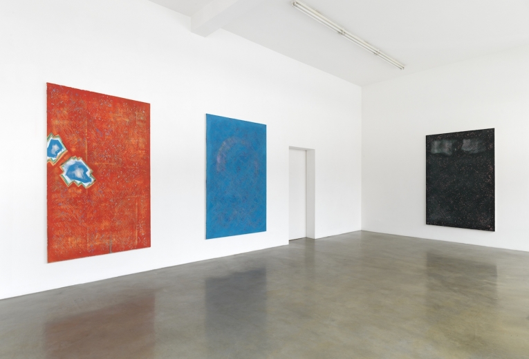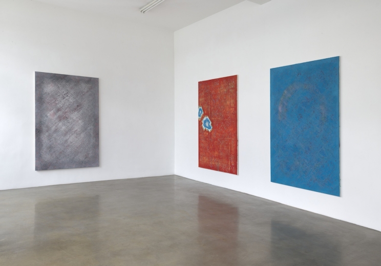 Hence the lineaments, suggestive of micro- at other times macrocosmic structures, are remnants of painting in reverse – heading back through various layers to the notion of the person who gave the respective painting or de-painting its title: Gianluca or Ian or Paola or Ash.